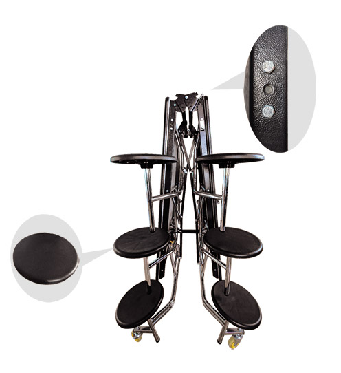 桌架 ●产品功能:整张桌子可以平行折叠,极大节省储存空间,机械扭簧设计,更容易进行展开或折叠作业 ●表面处理:喷粉或电镀(高等级电镀质量,可达到国家标准等级8级,720小时盐雾实验不生锈) ●脚轮:带刹车机构或不带刹车机构